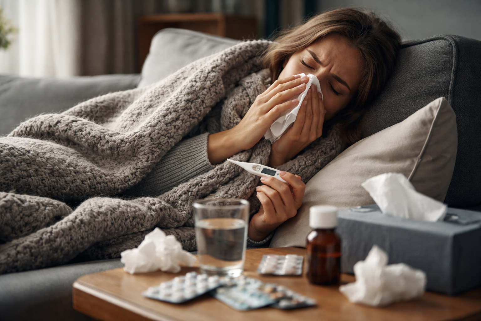 Pasien kerap mengalami demam tinggi yang berlangsung lebih lama, menggigil hebat, nyeri otot yang menyeluruh, sakit kepala berat, serta rasa lelah ekstrem hingga sulit beraktivitas. Selain itu, gejala saluran pernapasan seperti hidung tersumbat, pilek berat, batuk, dan nyeri tenggorokan juga sering menyertai.